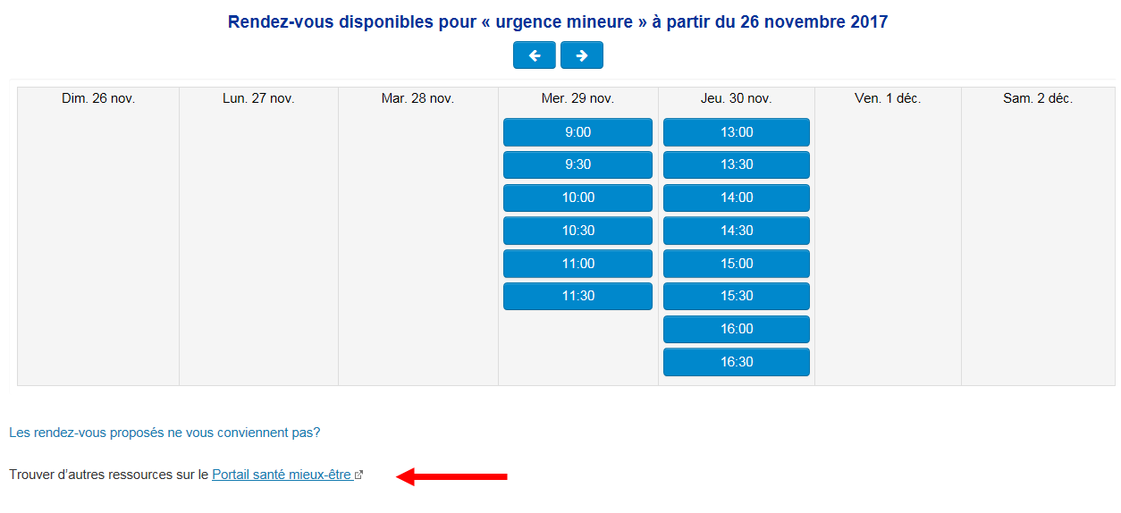Si aucun résultat ne vous satisfait, vous pouvez consulter le Répertoire des ressources en santé et services sociaux . Ce lien est accessible au bas du calendrier affichant les rendez-vous à proximité. Il est à noter que vous ne pouvez pas prendre rendez-vous en ligne avec cette option.