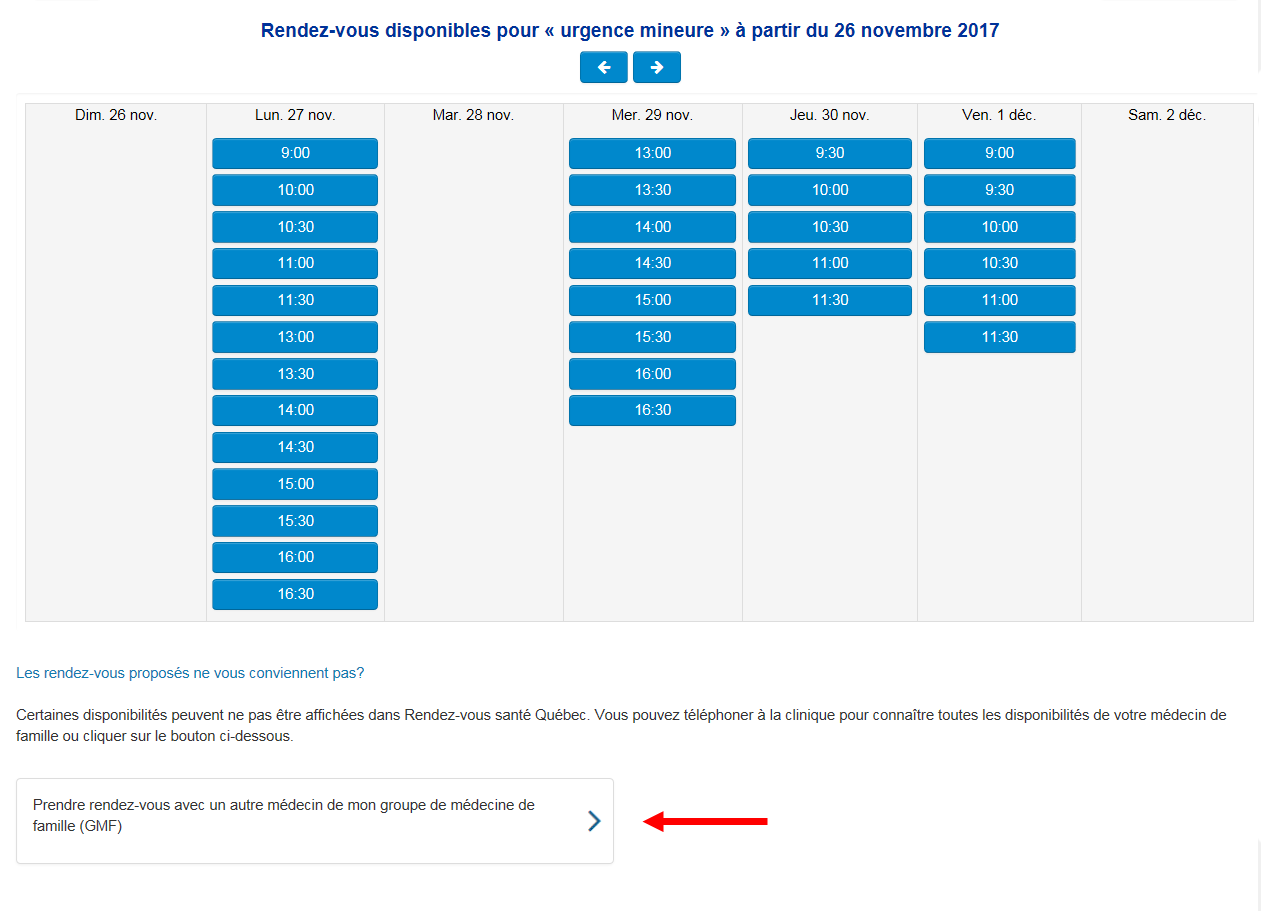 Si aucune plage offerte ne convient, vous pouvez communiquer avec votre clinique pour prendre rendez-vous ou cliquer sur « Prendre rendez-vous avec un professionnel de la santé de mon groupe de médecine de famille (GMF) » si votre clinique fait partie d’un GMF. Un autre professionnel de la santé du GMF pourrait avoir des disponibilités dans votre clinique habituelle ou dans une autre clinique.