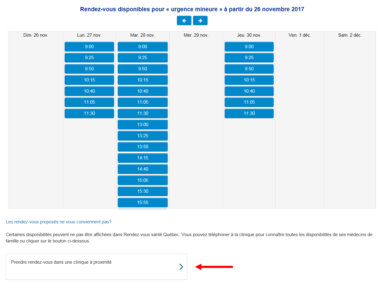 Si les rendez-vous proposés ne vous conviennent toujours pas, vous pouvez communiquer avec votre clinique pour prendre rendez-vous ou cliquer sur « Prendre rendez-vous dans une clinique à proximité ».